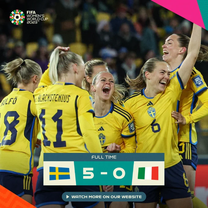 Suecia goleó 5-0 a Italia con un verdadero despliegue de fútbol y avanzó a los octavos de final del Mundial femenino que se disputa en Australia y Nueva Zelanda, consolidándose como líder del Grupo G de Argentina.